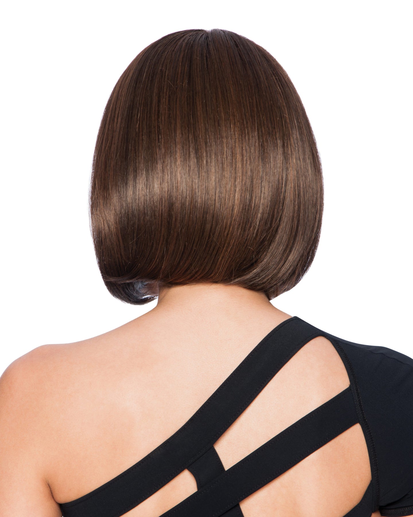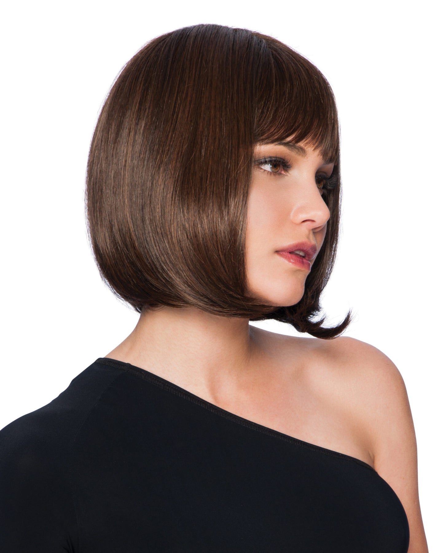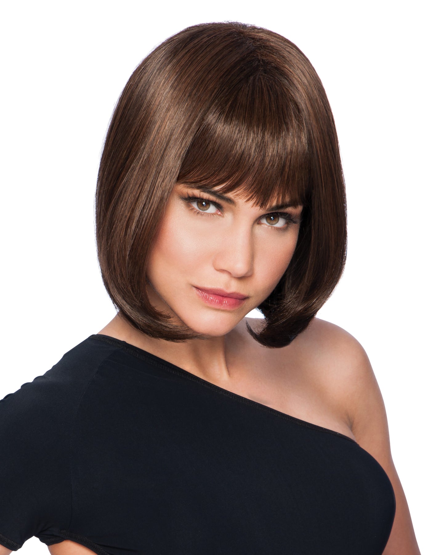 The understated pageboy silhouette gets modernized on this alluring wig with blunt, shoulder-length edges, an off-center part and soft, full bangs. Tapered sides angle into an ever-so-slightly shorter back for a cool, polished look.