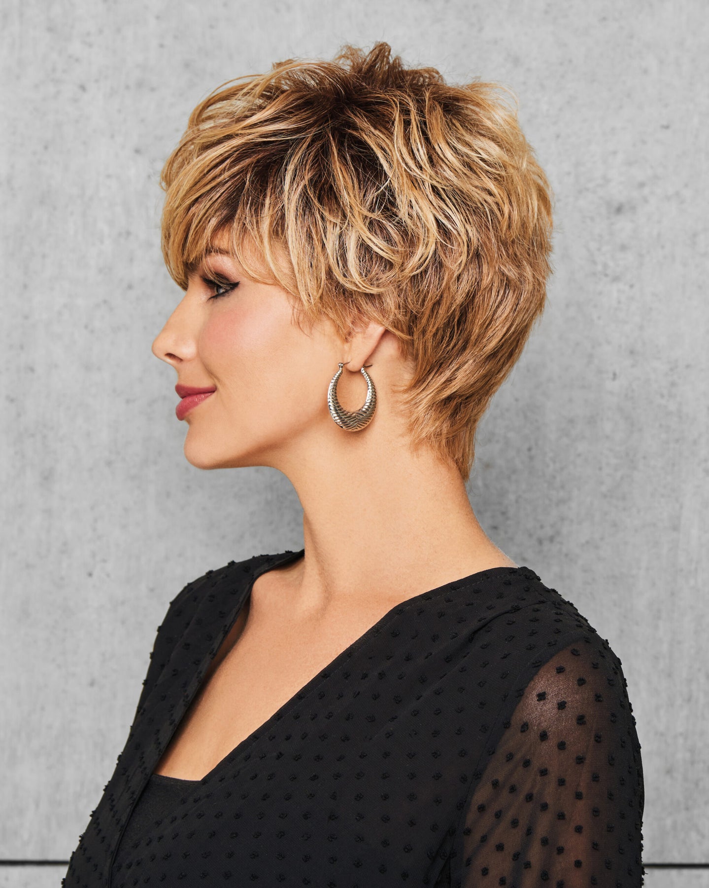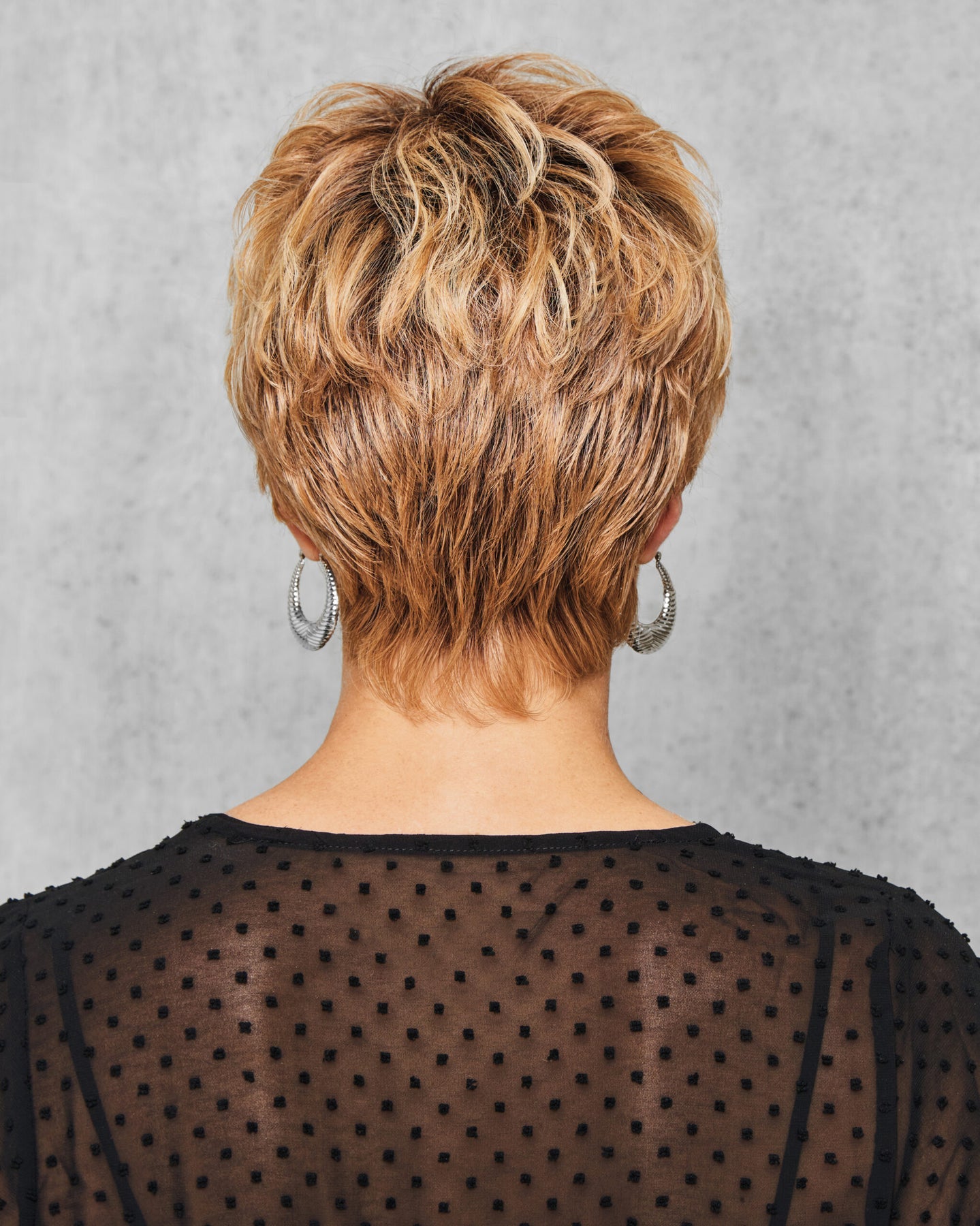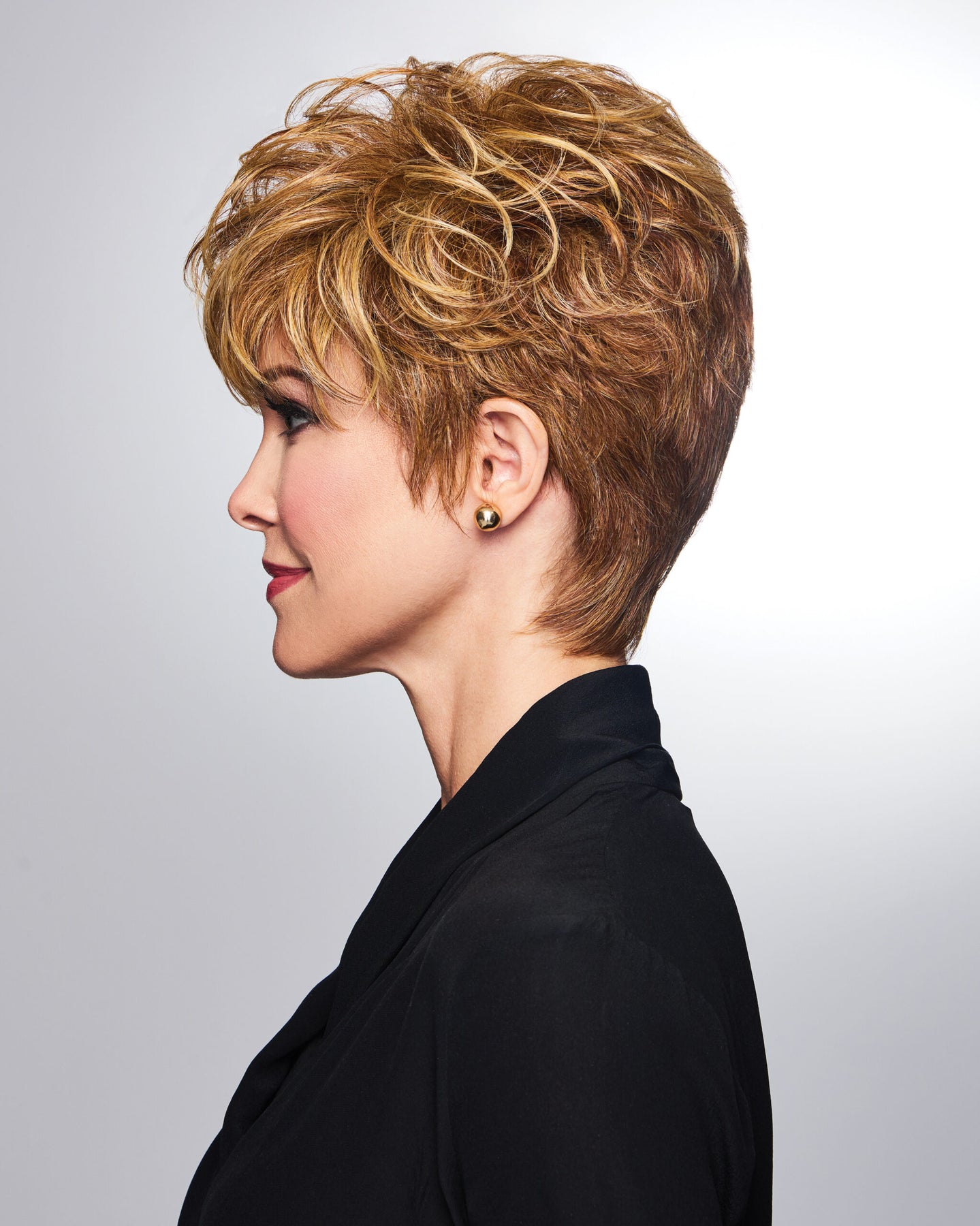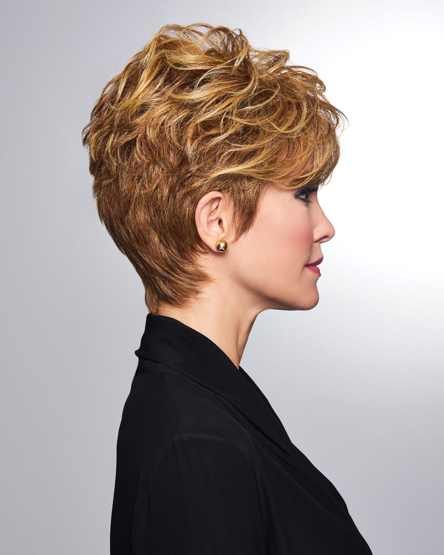 This contemporary tapered short cut features sides and nape that sit close to the head, and longer layers on top for lots of playful volume. A sophisticated gentle wave throughout gives the overall style modern texture and movement.