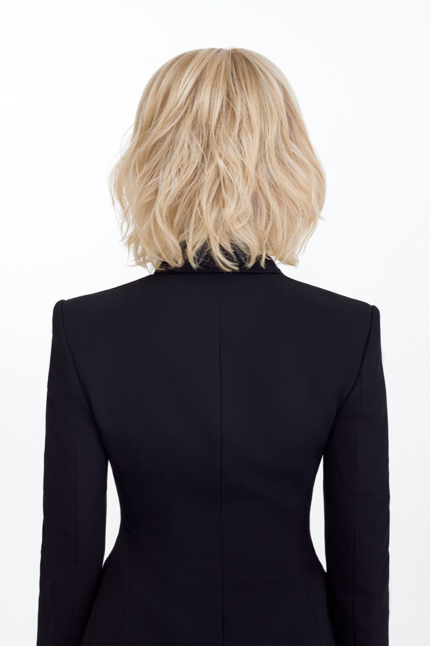 Long mid-length layered bob with feathered bangs, a smooth silky top, textured layers that fall below the collar and a Sheer Comfort cap that is designed with a mesh top and lace front for an undetectable hair line and all day, every-day comfort.