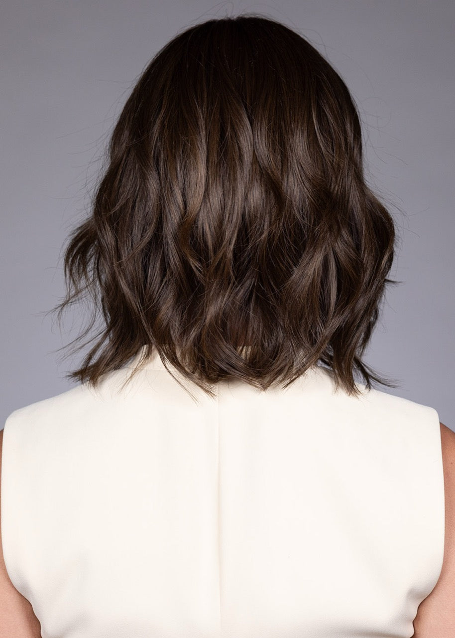 Truffle Cream-R 8/25+4 | A rich, medium brown base (akin to the color of a chocolate truffle) blended with creamy, light blonde highlights. The combination creates a harmonious balance between depth and lightness, resulting in a multidimensional brunette with subtle blonde accents. Rooted to create a natural, lived-in appearance.