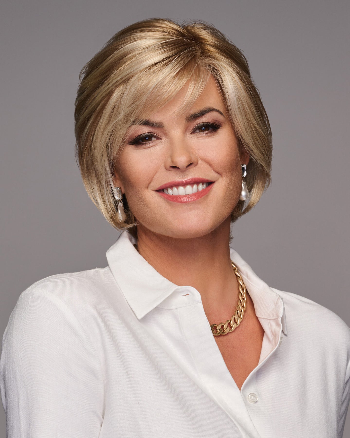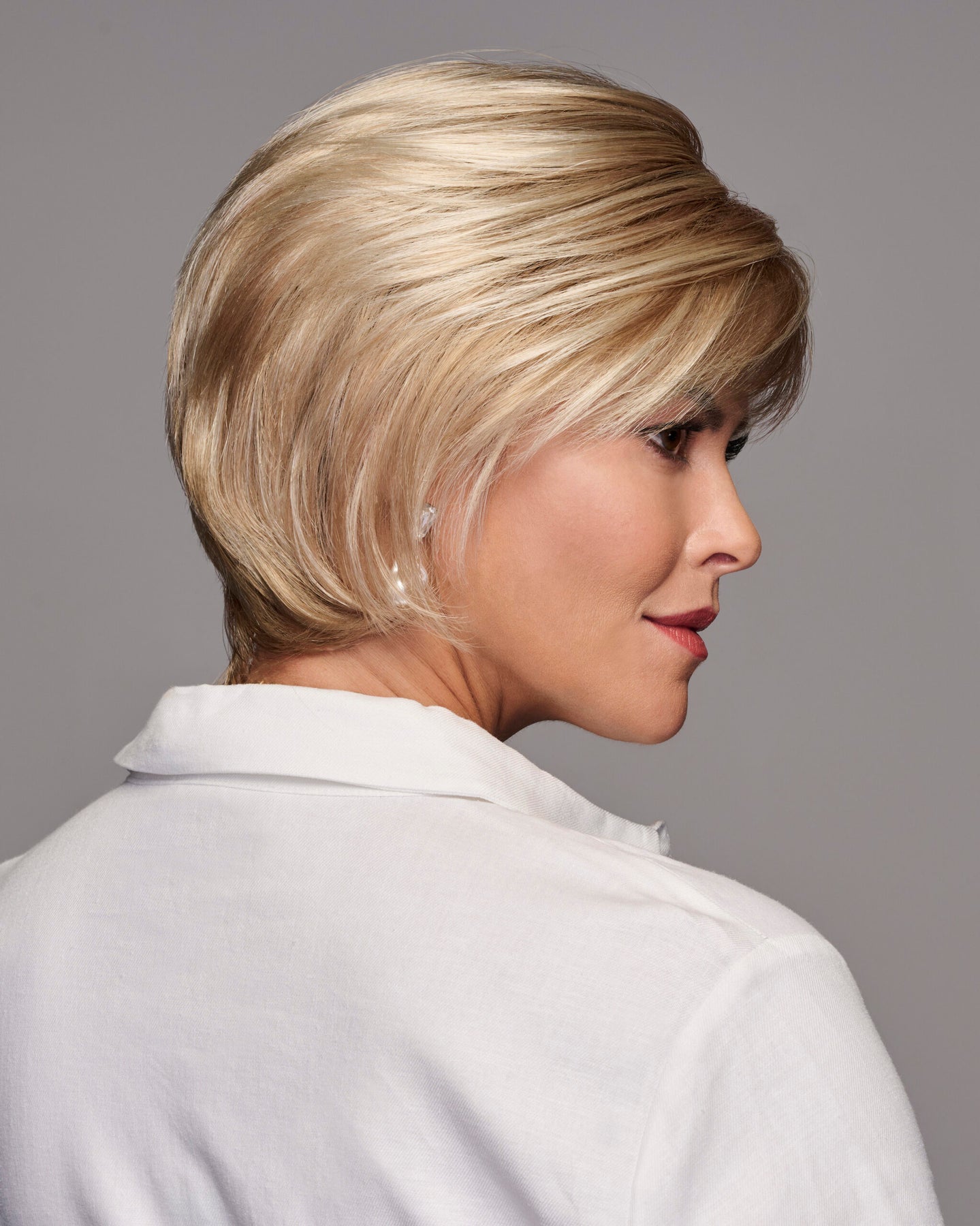 Get a fresh, chic and undone look with this textured cut. Features include soft layers throughout, a monofilament part, and razor-cut back and sides. The extended lace front allows you to wear with a soft fringe coming onto the face or swept up and away. Its all-over shattered texture and piecey bangs call attention to the eyes and make a lasting impression.