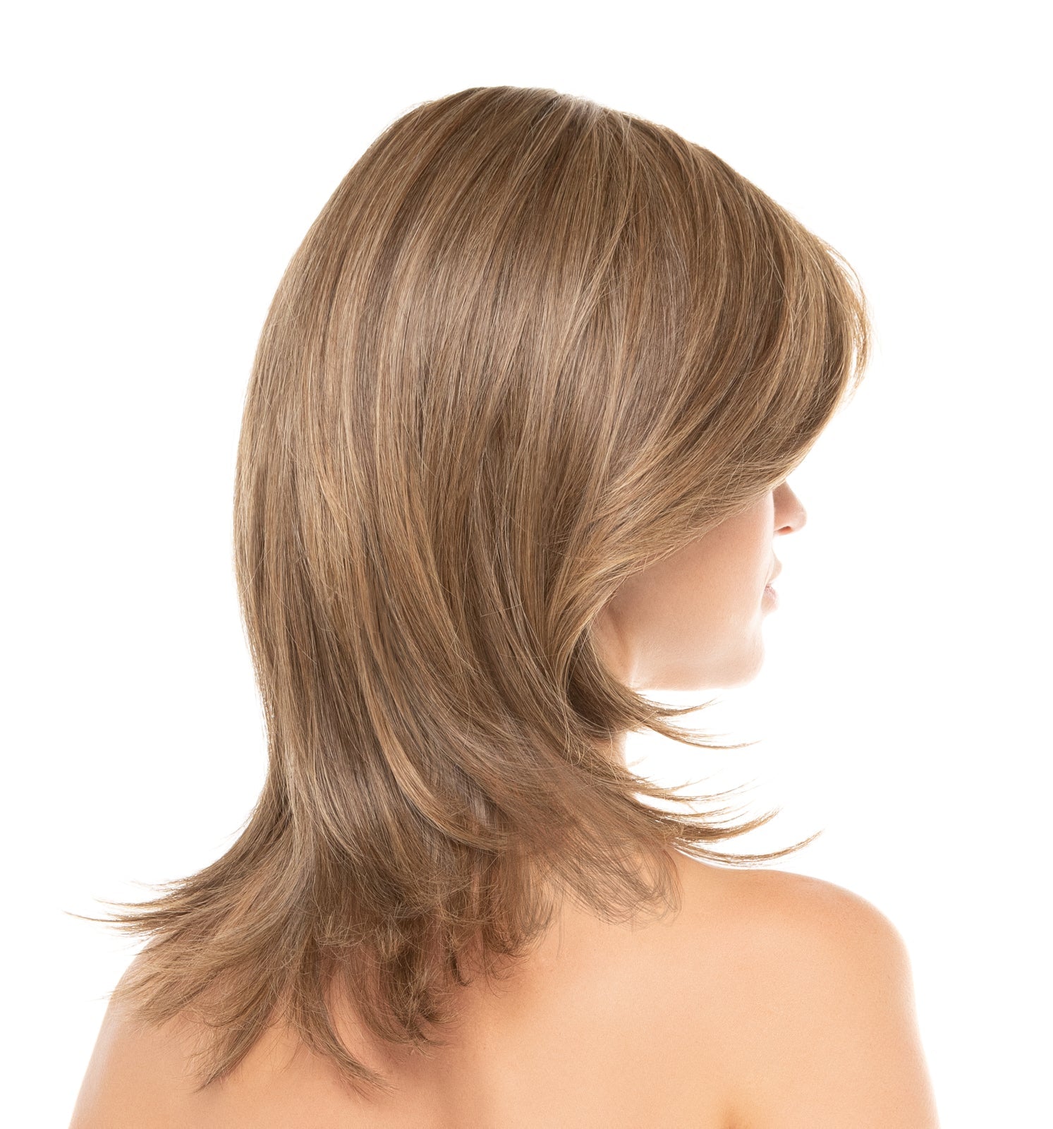Soft sweeping feathered layers fall below the shoulder for a surprisingly light and long hair style. The ear to ear lace front and double knotted mono top give an undetectable hairline while maintaining comfort