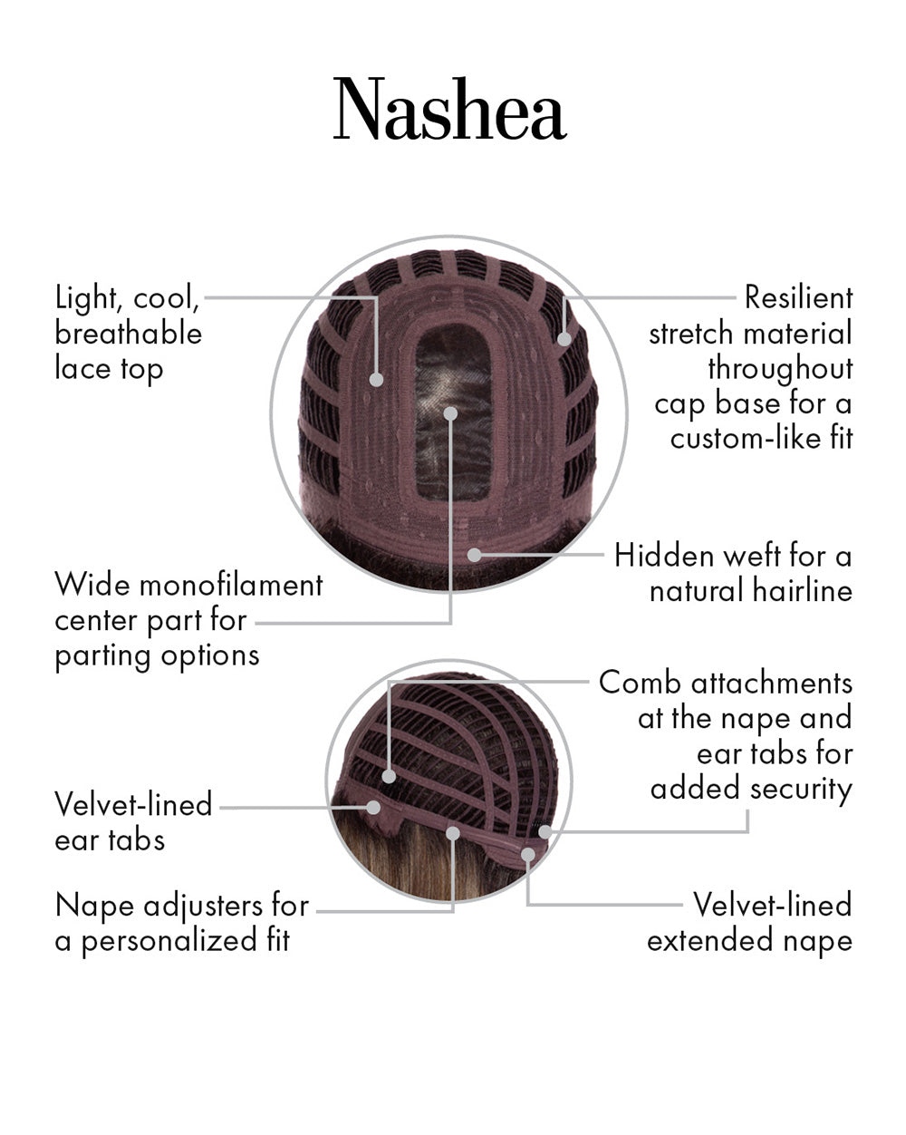 Nashea sets the mood with her charming personality and flawlessly natural style. She has a center monofilament part and bangs that never need trimming. With hair that looks and feels this real… just wait until the compliments start rolling in.