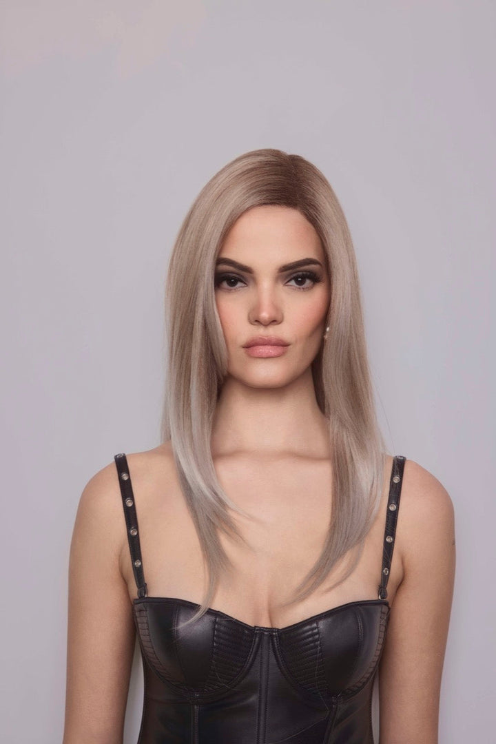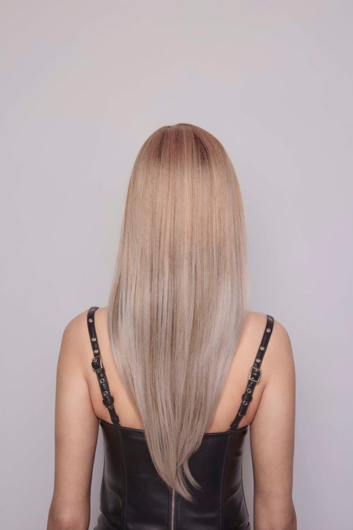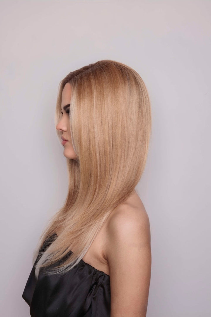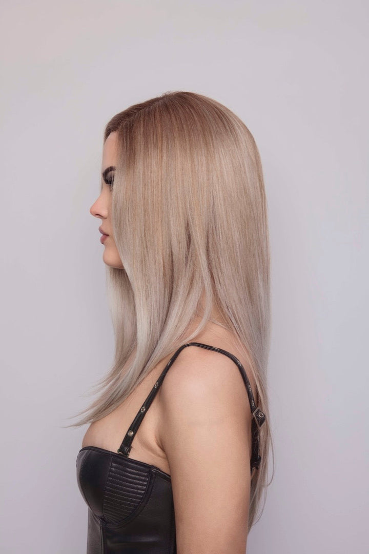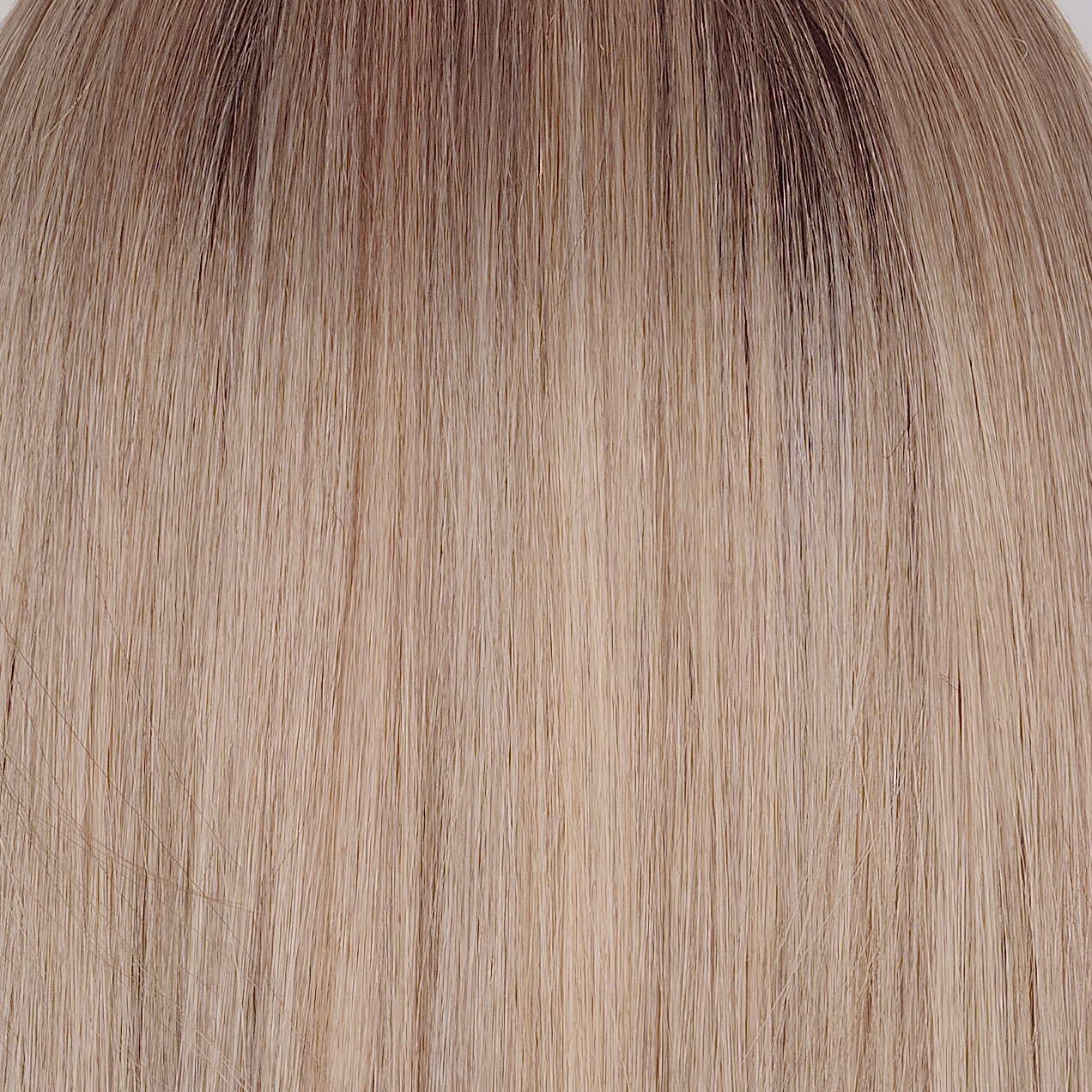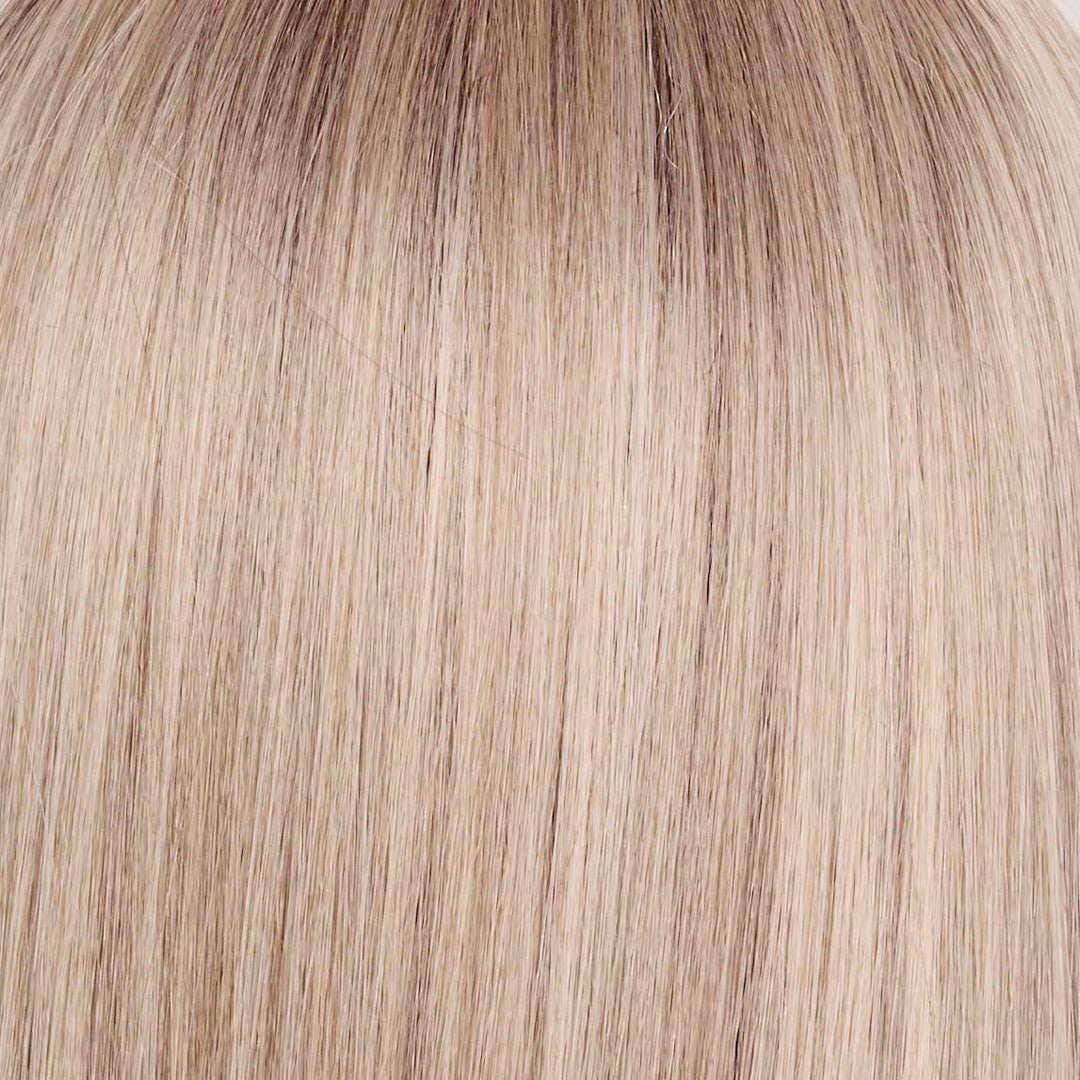 Buttercream Blond-R | The rooted sister of Buttercream Blond is a stunning baby blond shade with a warm chocolate root that exudes elegance and sophistication. This exquisite hair color is meticulously crafted with an array of tonal blond tones, seamlessly woven to perfection. The harmonious blend of light ash, medium honey, and pale gold hues creates a luxurious and radiant finish, giving this shade a touch of class and the perfect balance of blond tones.