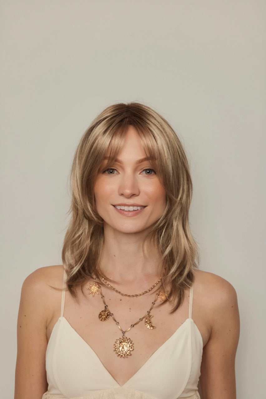 Bell Tress Madison is my very favorite wig! It’s the perfect length, with just the right amount of wave, and the fibers feel so real. I am a 21 1/2 size and she fits me perfect. I get so many compliments on my hair, especially the color (Caramel Blond-R). People comment how pretty the color is and the amount of depth it has, and think I must spend a fortune getting my hair colored (ha-ha). Not one person, not even my best friend, knows she’s a wig! I just ordered my third Madison because I love her so much! I own 21 Belle Tress wigs and I love each one, but Madison is definitely my go-to. I can wear her 20+ times (long days), plane trips, etc., without needing to do anything to her. I only use water, no products at all and she rarely needs a heat treatment. Frannie’s has the BEST customer service and I highly recommend buying wigs from Frannie’s!