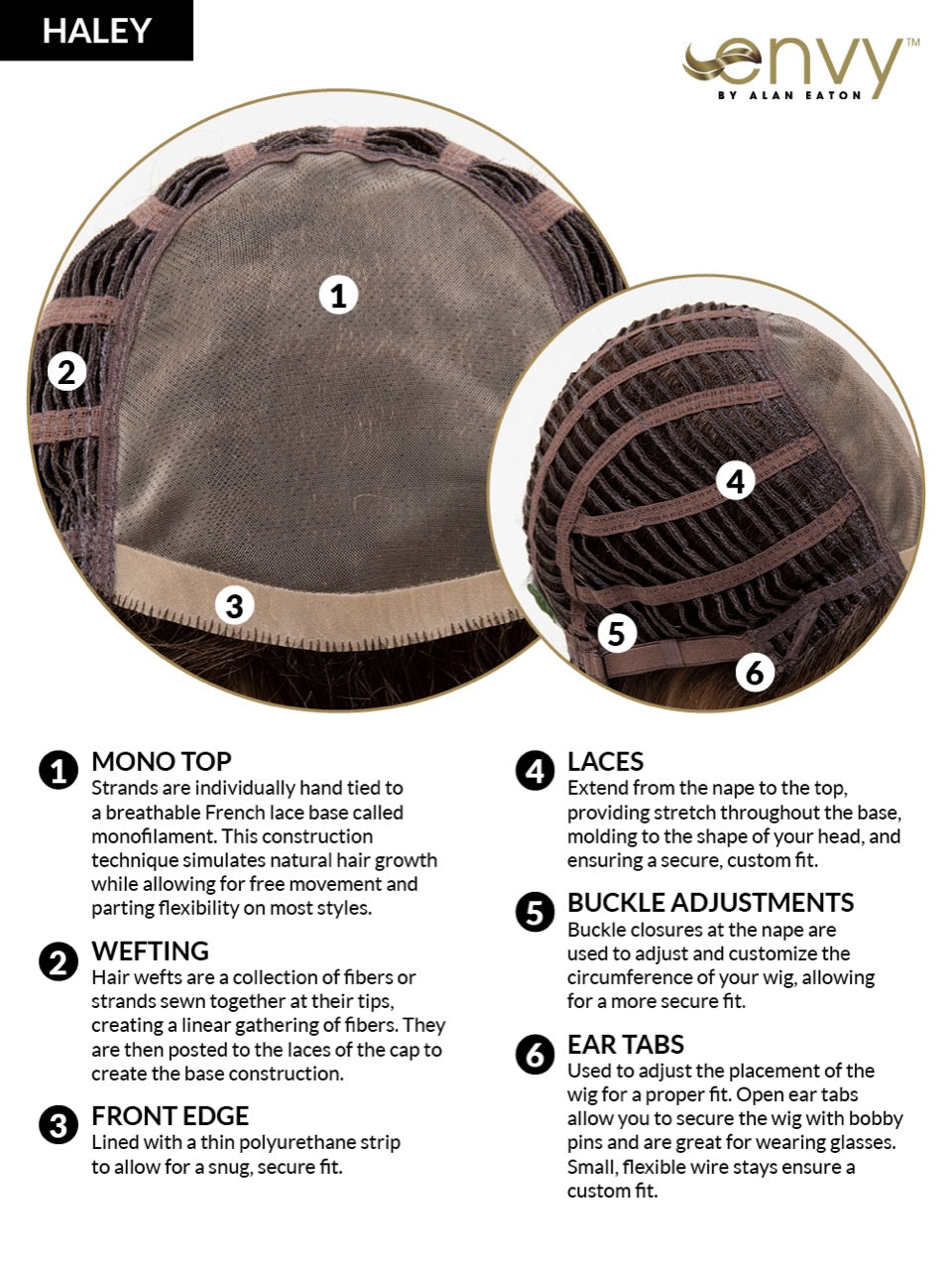 Haley by Envy takes strategically placed layering to offer movement and ease of styling. Shake it out and comb in place to create a modern silhouette and casual styling. Lightweight mono top construction lends itself to a more natural and effortless fashion statement.
