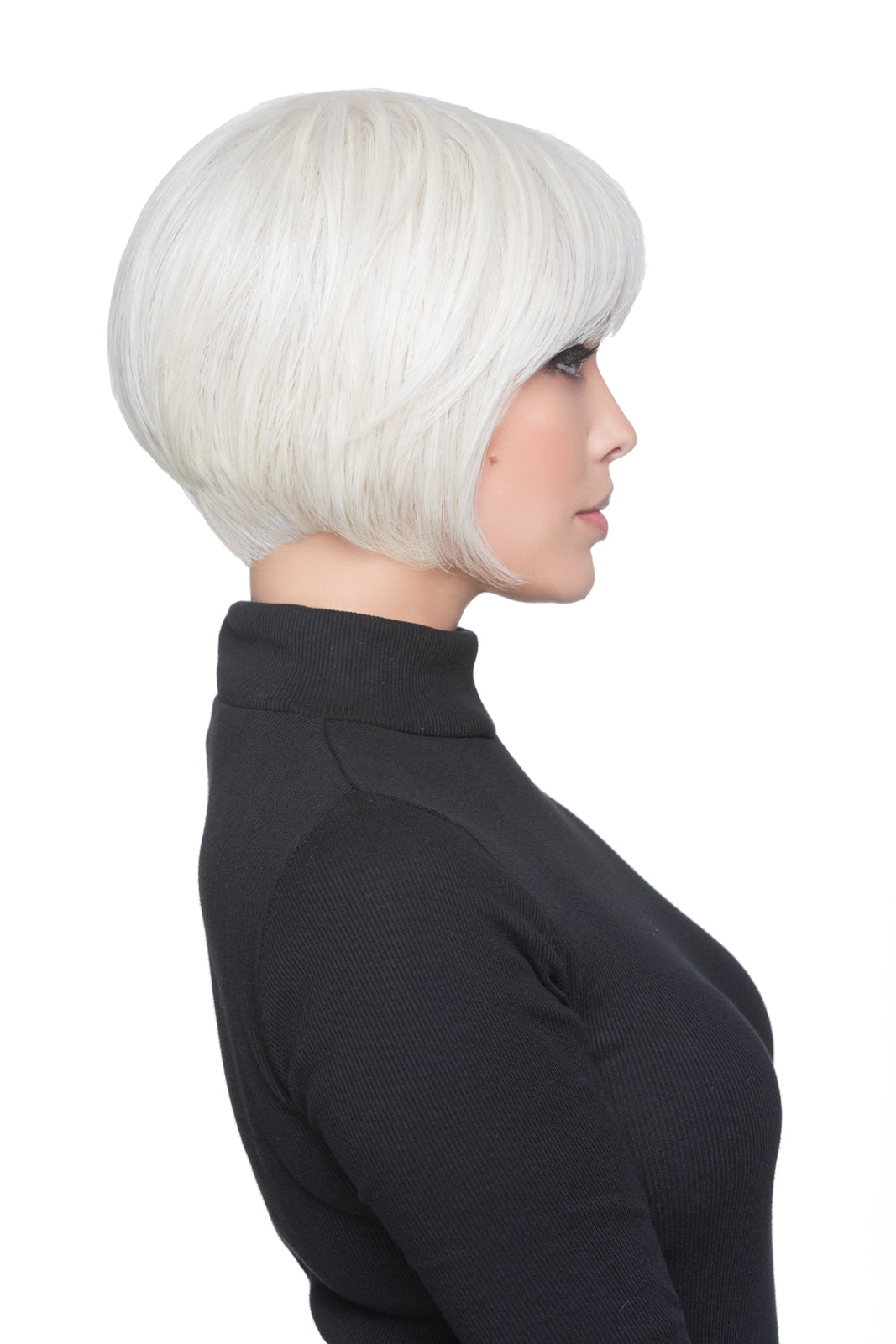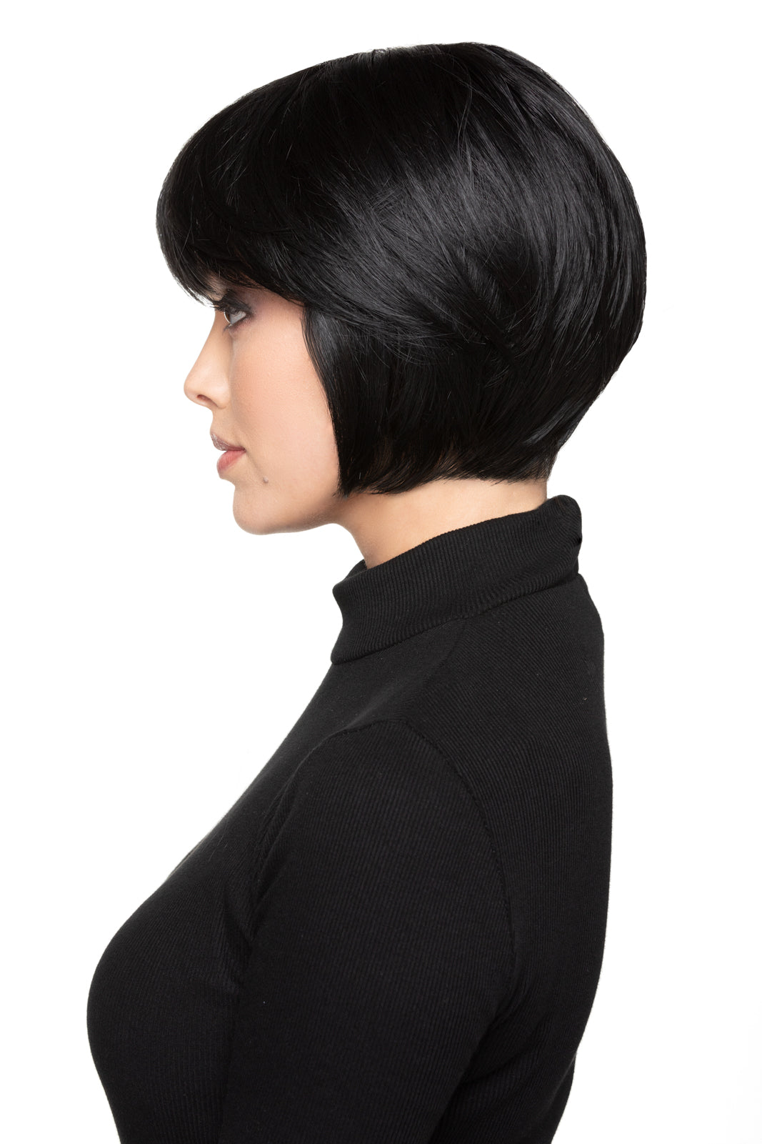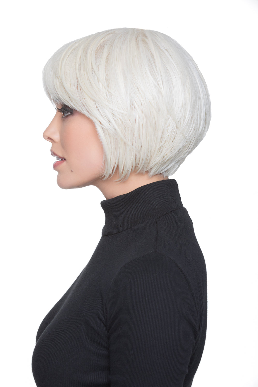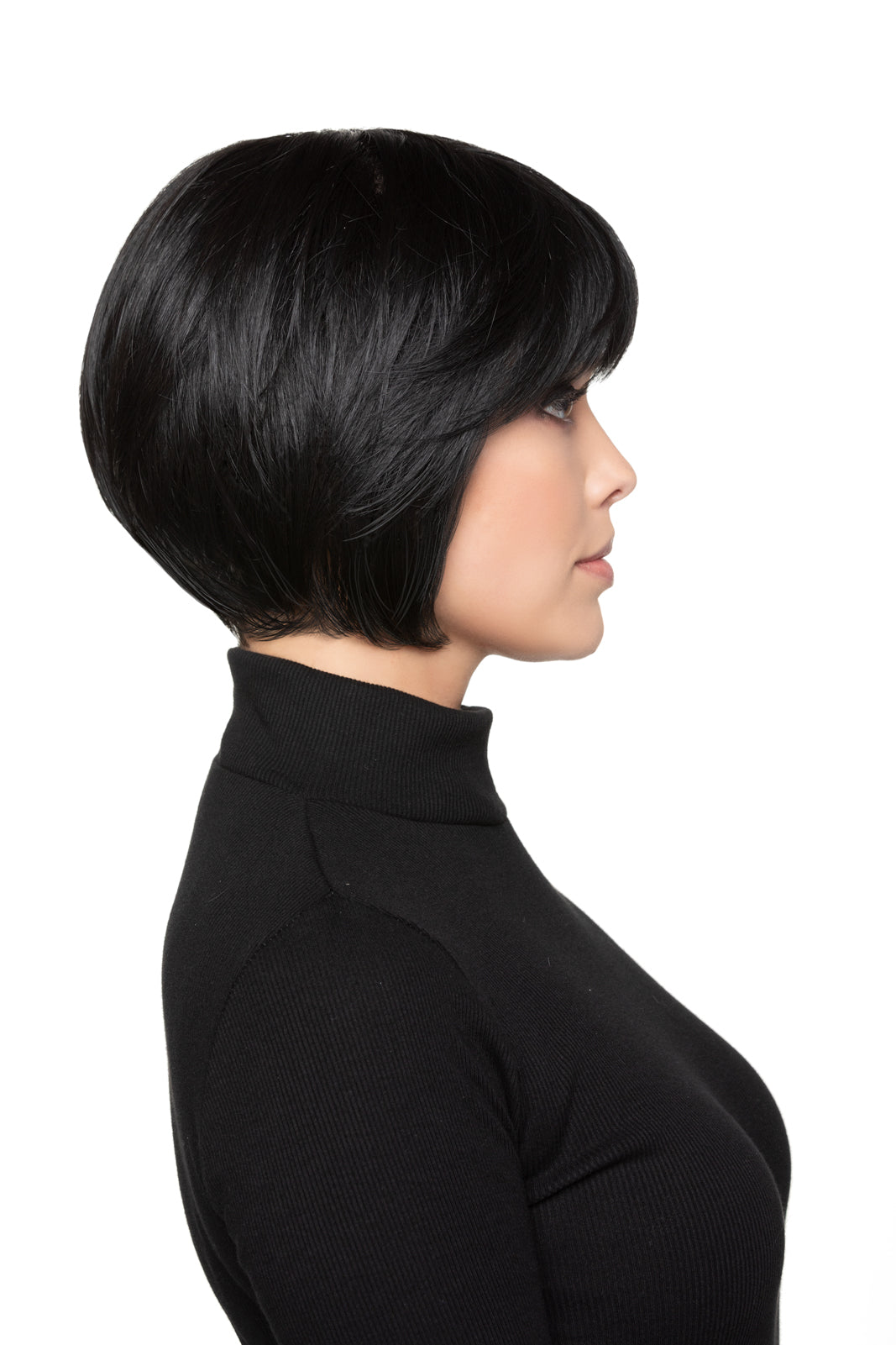 A Geometric blunt cut with perfectly-in-place bangs, a bob back that tapers at the nape, and our custom fitting Sheer Comfort™ sculpted lace front and a soft mesh monofilament top for an undetectable hairline and all day comfort.