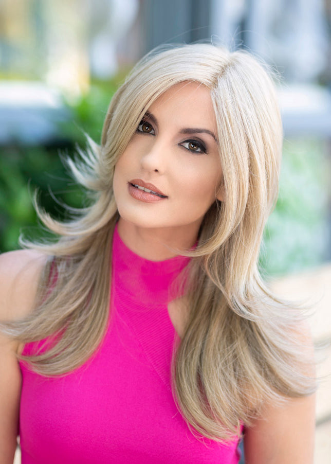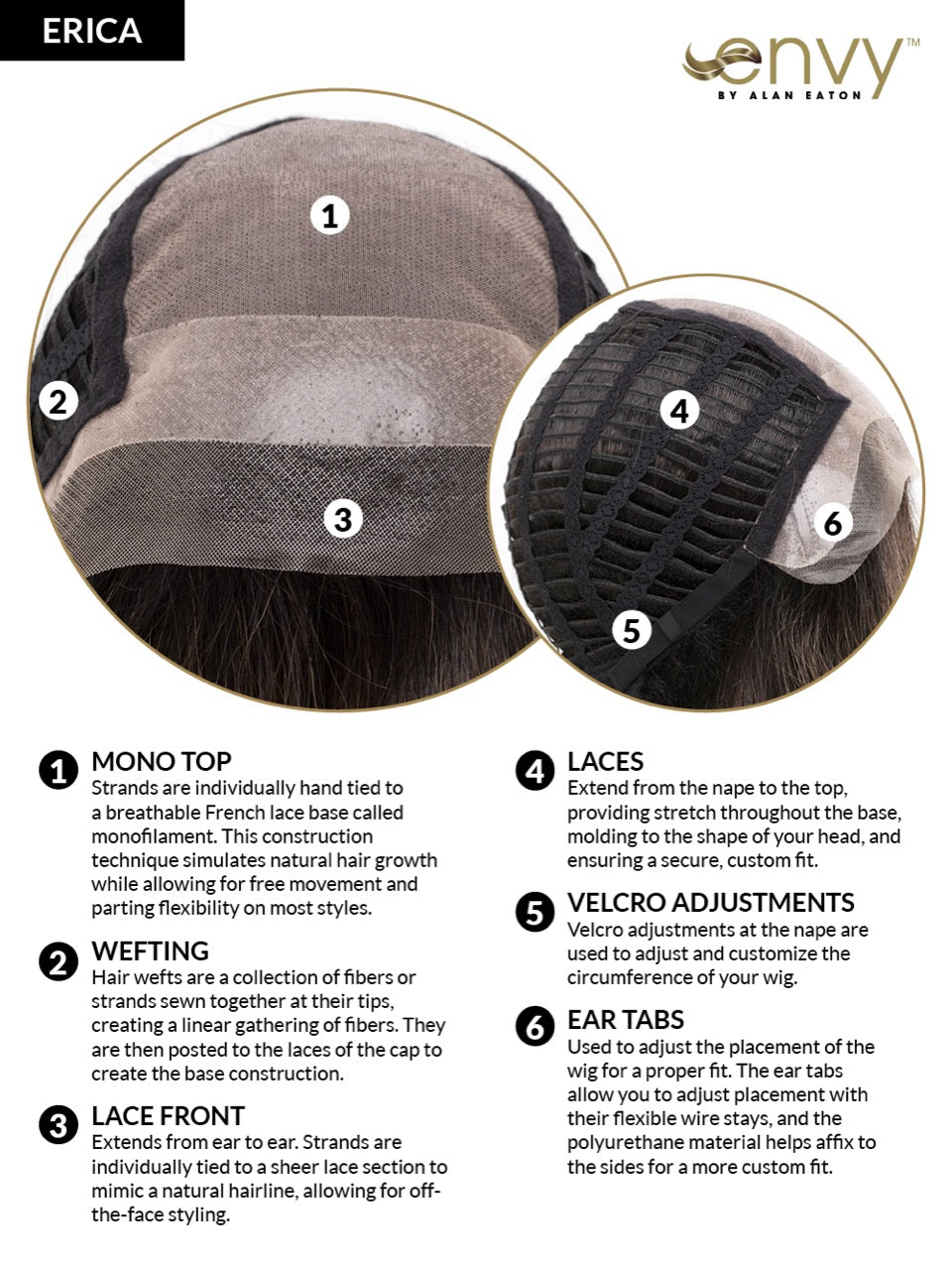 Erica by Envy Wigs is a long, layered wig with sleek, straight strands and effortless movement. The ear-to-ear lace front and monofilament top provide a natural hairline and versatile parting, while the hand-tied cap ensures lightweight comfort. Made from human hair and heat-friendly fiber for versatile styling.