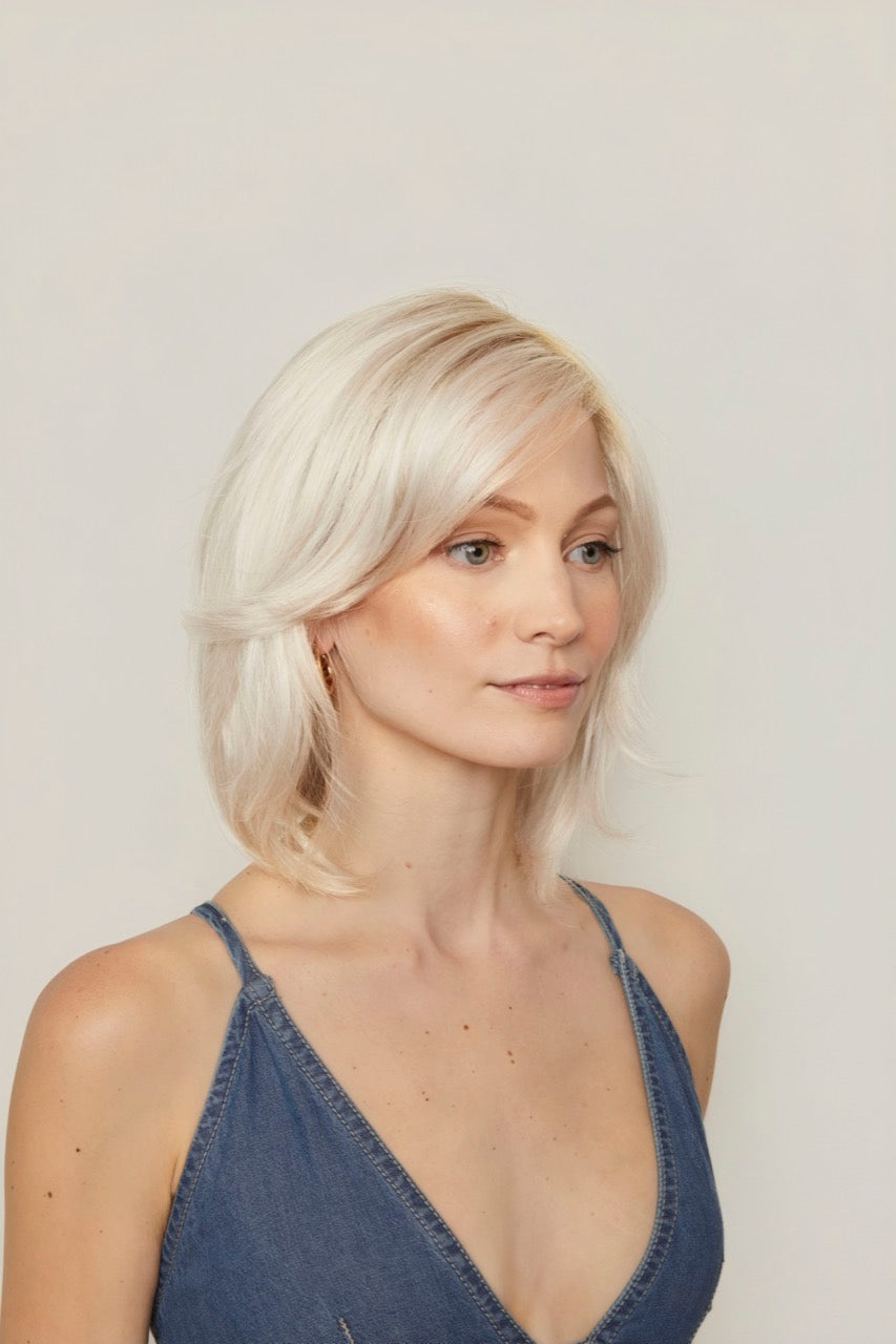 I LOVE, LOVE, LOVE this wig. I saw different reviews on this one and each wig looked a bit different. It happens! I lucked out and got the perfect flip at the bottom, slight side wave, and great fit all around. It took me a few hours to get used to the milky opal color, as I've never ventured towards the light shades. As soon as I put on a little darker face color, it abra cadabra looked fantastic! Don't give up on your "iffy" wigs, until you've played around with it. I couldn't be happier! Love Frannie!!!!