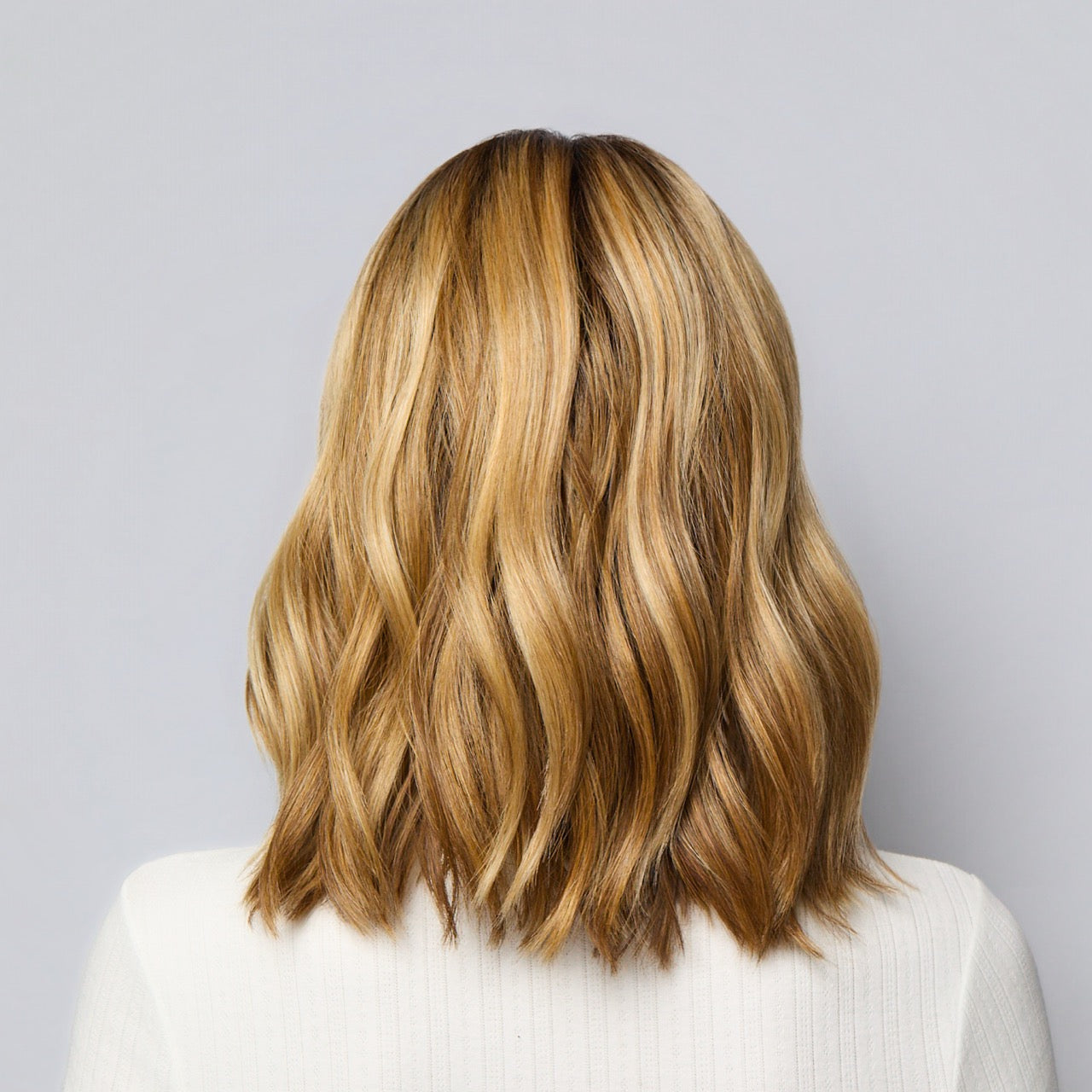 Bronzed Honey-R | A perfect blend of rich, warm golden blond and medium chocolate brown tones, complemented by a dark chocolate root that adds a luxurious, dimensional effect.